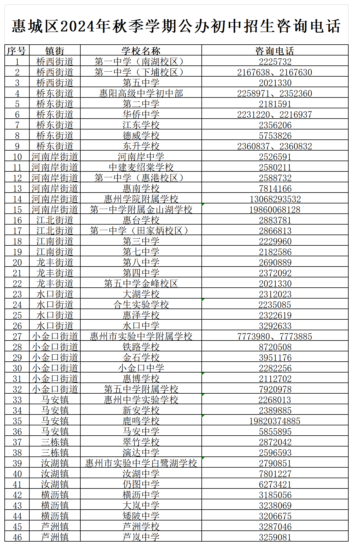 1.惠城區2024年秋季學期公辦初中招生咨詢電話
