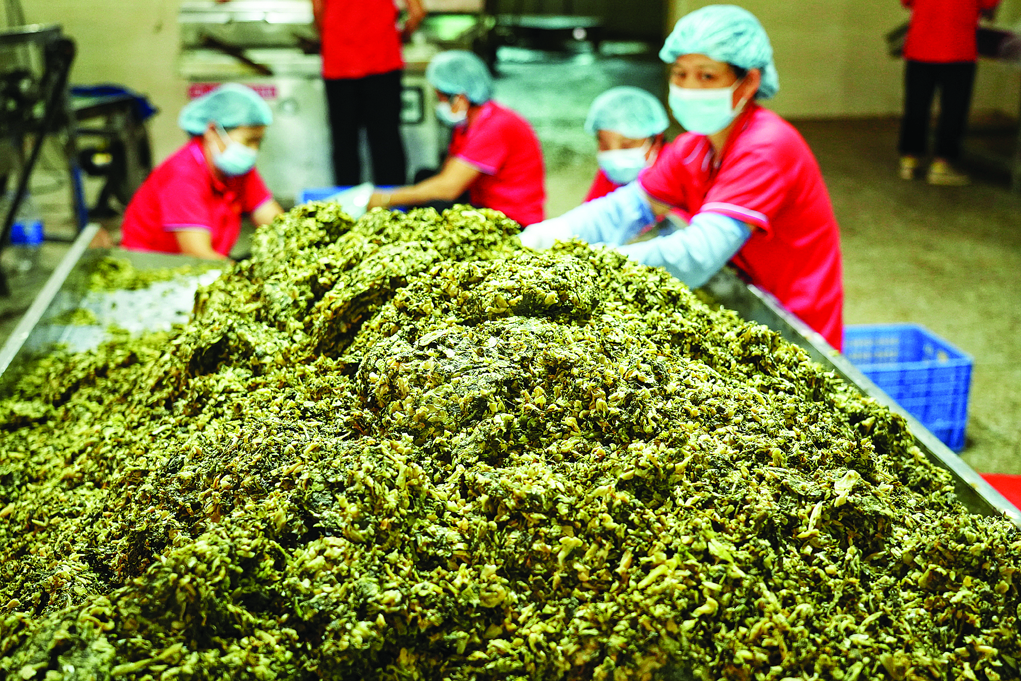 廣東譚喜農業科技有限公司生產車間內,工人在加工梅菜。