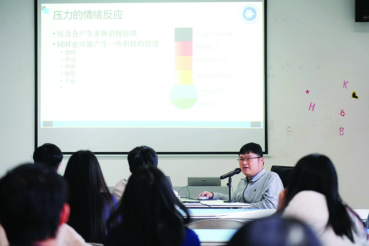 入職兩周后,學校給陳斌安排了一次專題講座。59個名額,放出去10多分鐘就被學生搶完了。專題講座的主題是《科學認識壓力》,期間播放了緩解壓力的互動視頻,陳斌還結合自身學習經歷與學生進行了互動交流!皼]想到陳斌還挺能講的,專業理論功底很扎實!辩娢挠钫f。