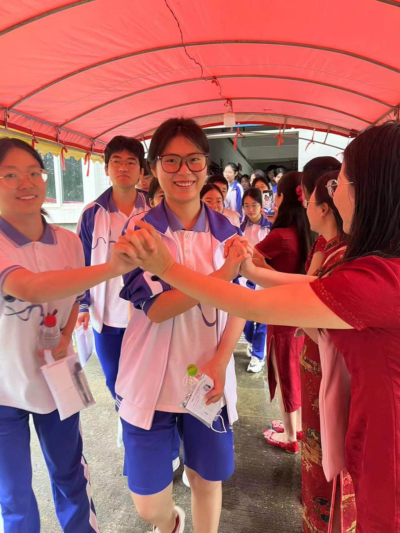 在惠州中學,校領導帶領高三年級全體教師站在紅毯兩旁為2024屆考生送上祝福。身穿紅色上衣的老師們,和考生一一擊掌,目送他們走向“成功門”。