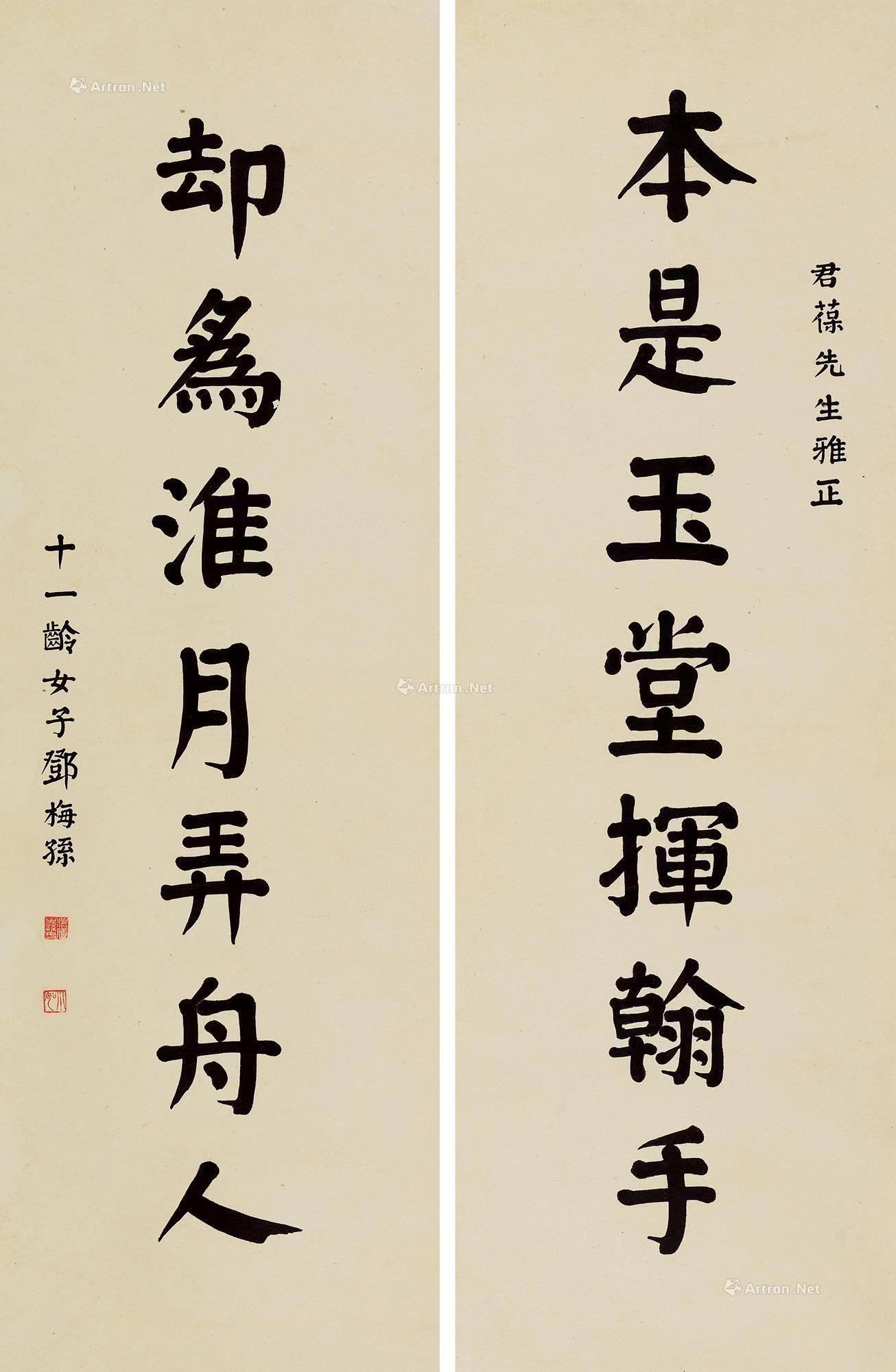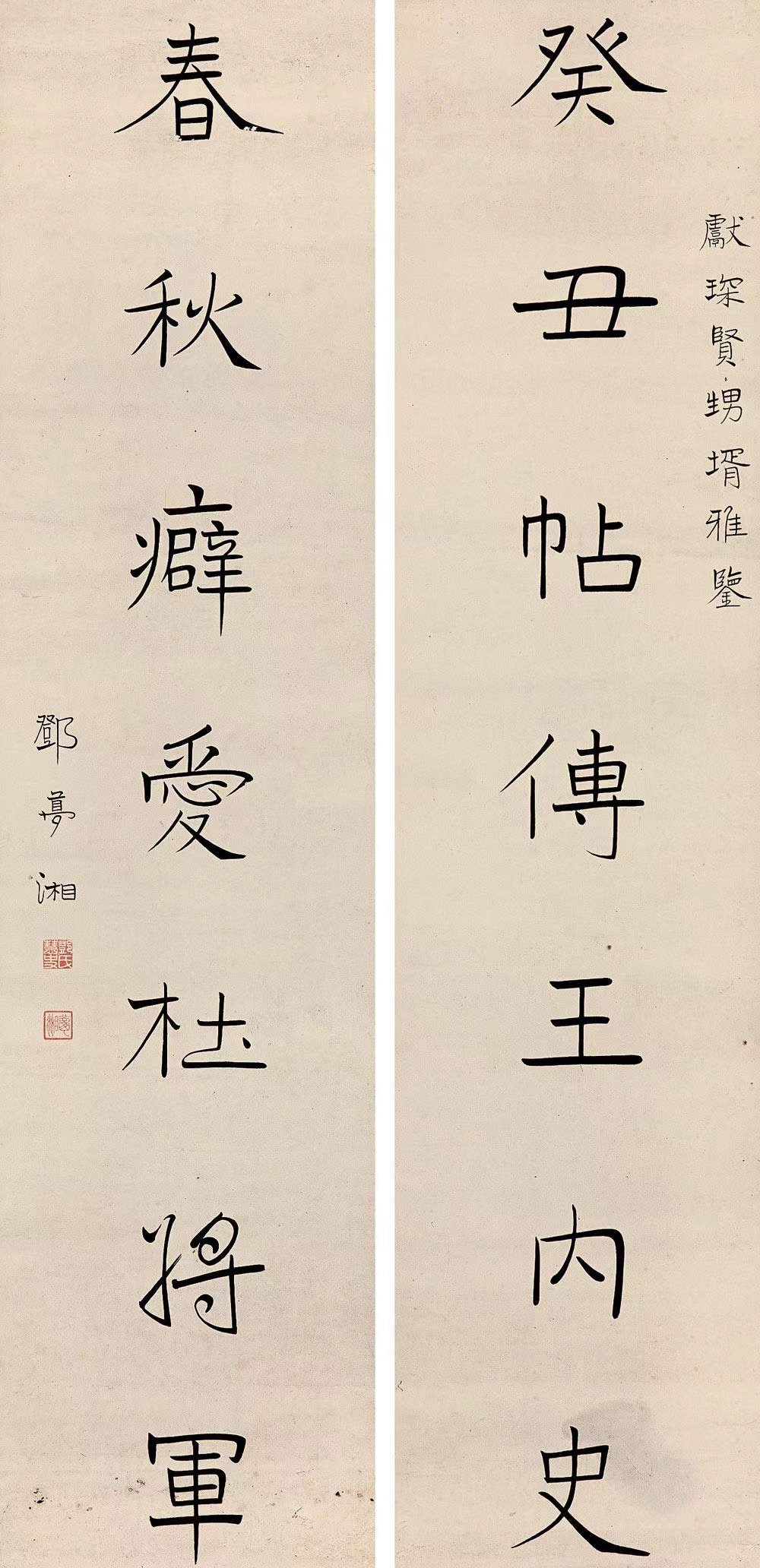 民國初年,邑人裘集裳結簫社于水東白鶴峰,向嶺南文化名流征詩,夢湘自書二絕句以贈,清越之音傳遞了詩人面對亂世的深沉意緒。詩云:“清宵不是可憐宵,白鶴峰頭勝侶邀。譜出幽人幽景好,滿江明月一聲簫。”又云:“亂世徒聞治世音,沉沉堪痛劫灰深。可能念四龍吟管,吹復群氓太古心。”觀此條幅,頗能見承修筆意和法度,論書風,可以說她是“多似為而翁”的。但又有自己的風格特點,如折拗彎鉤處便每每化方為圓,瘦而實腴,比之其父,似乎是少了幾分剛介與執著,而多情才女的秀逸風華卻也因此更加凸顯,別具一種剛柔并濟之美。廣東省博物館藏有鄧夢湘楷書七言聯:“淺碧新瓷烹玉茗,硬黃佳帖寫銀鉤。”其風貌意趣亦與之頗相類似。