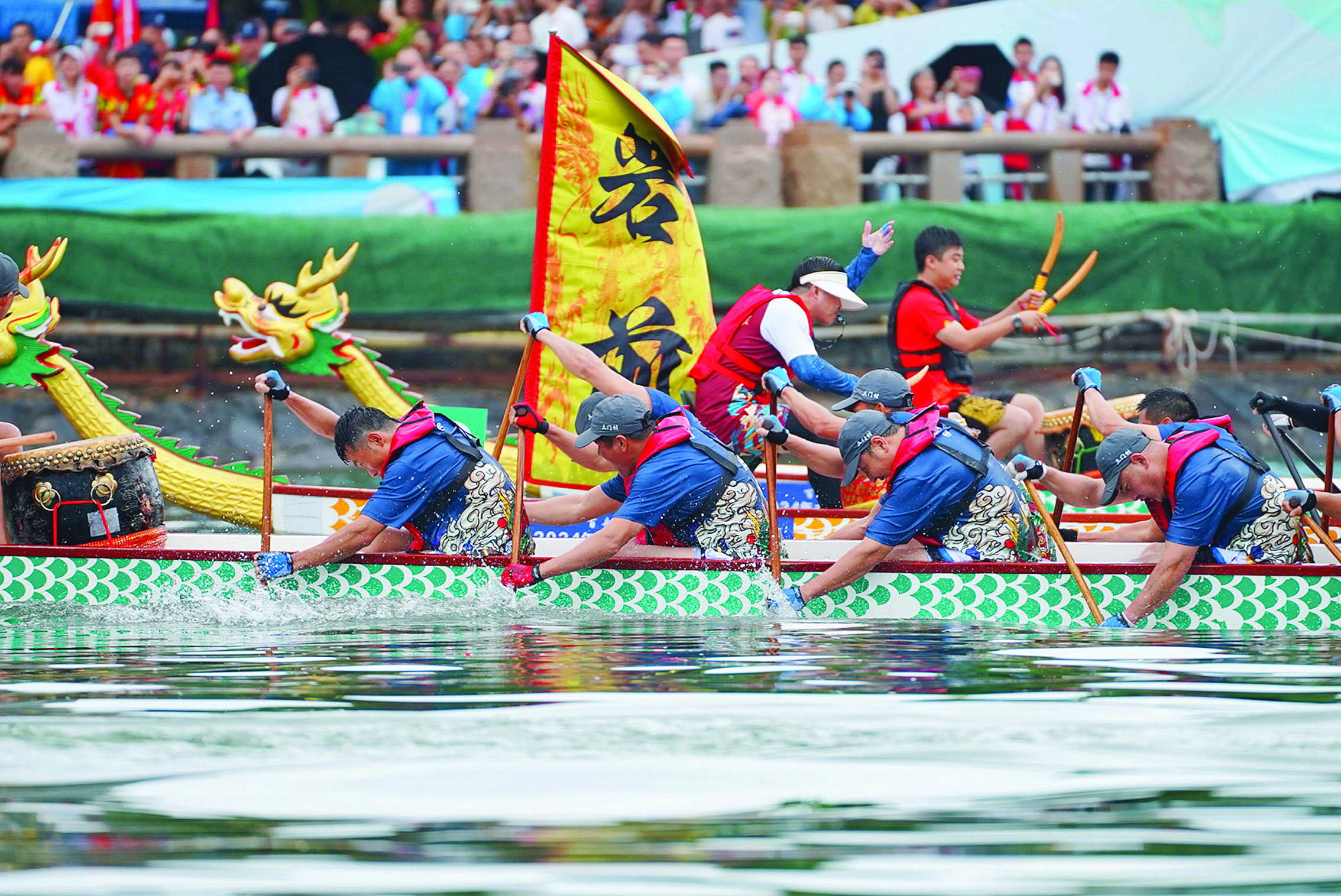 隨著一聲清脆的發(fā)令槍響,一艘艘龍舟勢(shì)如箭發(fā),伴隨著節(jié)奏感十足的鼓點(diǎn),運(yùn)動(dòng)健兒奮楫爭(zhēng)先,一葉葉龍舟劈波斬浪,在海面飛濺起朵朵浪花。起步爭(zhēng)先、加速追逐、并駕超越、拼搏反超……海面上,龍舟競(jìng)渡,選手們揮槳如飛,一路踏浪前行,向著終點(diǎn)奮力沖刺。岸上,人頭攢動(dòng),綿綿細(xì)雨也絲毫沒有影響市民觀賽的熱情,加油吶喊聲此起彼伏,氣氛十分熱烈。競(jìng)技的激情與觀眾的熱情交織在一起,令人熱血沸騰。