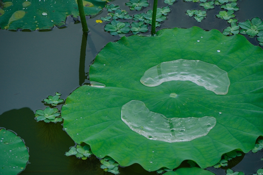 雨水積存在荷葉之上,也成一景。