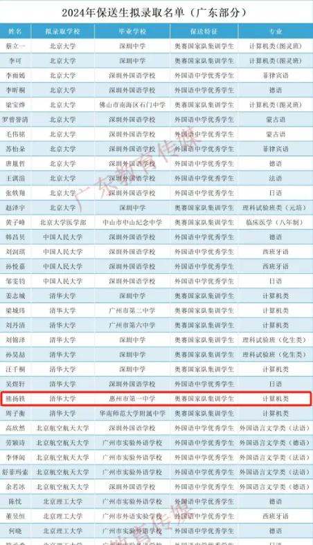 名單顯示,2024年,惠州市第一中學學生熊揚軼作為奧賽國家隊集訓學生,被保送至清華大學計算機類專業。