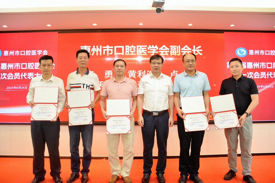 唐尤超(右三)為新一屆惠州市口腔醫學會副會長頒發聘書。