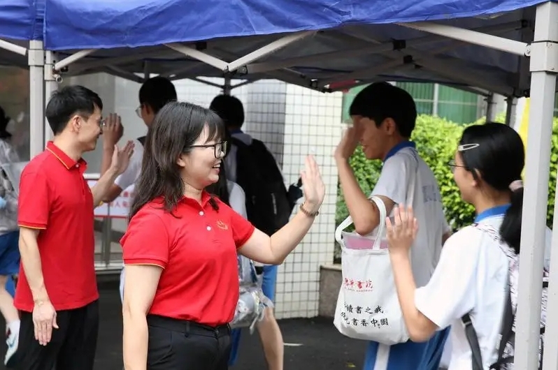 惠州市綜合高級(jí)中學(xué)老師與考生擊掌以示鼓勵(lì)。