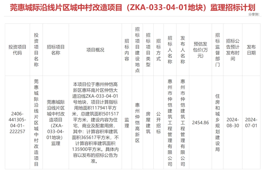 7月1日,據惠州市公共資源交易中心信息,莞惠城際沿線片區城中村改造項目(ZKA-033-04-01地塊)發布施工招標,預計發包價為178627.77萬元。