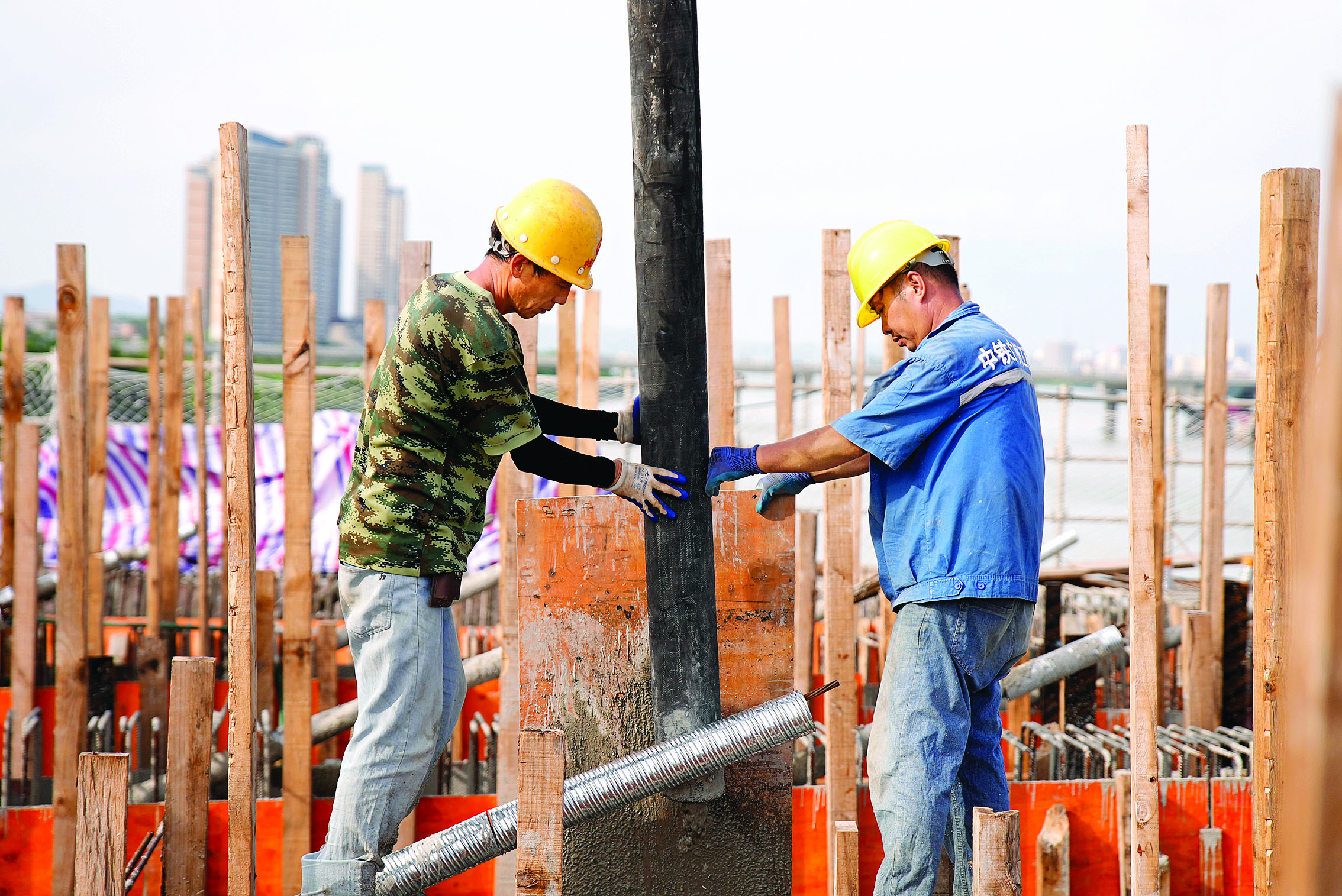 鵝城大橋建設(shè)現(xiàn)場,工人在烈日下澆筑水泥。