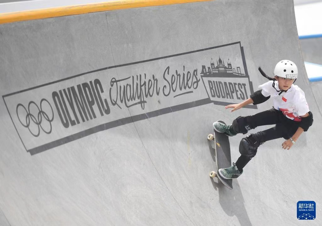 6月20日,中國選手鄭好好在巴黎奧運會資格系列賽布達佩斯站滑板女子碗池預賽中。新華社記者 賀燦鈴 攝