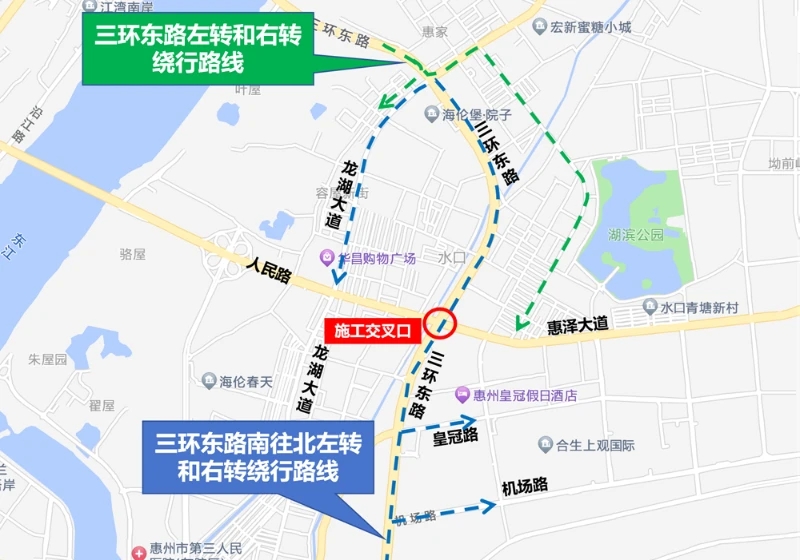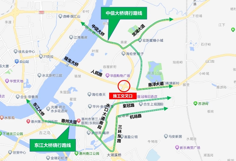 三環東路/惠澤大道交叉口施工期間,三環東路主線保持3車道通行,南進口和北進口禁止車輛左轉和右轉,西進口和東進口禁止車輛直行和左轉。原有從隆生大橋-人民路-惠澤大道通行的過境車輛,請盡量通過中信大橋、東江大橋等過江通道外圍繞行;對于人民路沿線往返惠澤大道沿線的車輛,請從周邊三環東路、龍湖大道、皇冠路、機場路等道路近端繞行。