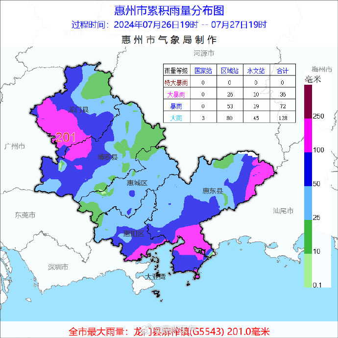 過去 24 小時,我市南部縣區和東部山區出現暴雨到大暴雨,其余地區中到大雨局部暴雨,局地伴有雷暴和 6~7 級短時大風,喜洲島錄得最大雨量 182.1毫米、其次為惠東高潭179.3毫米。預計,今明兩天我市仍有大雨到暴雨局部大暴雨,需繼續防御強降水和強對流天氣及其可能引發的次生災害。