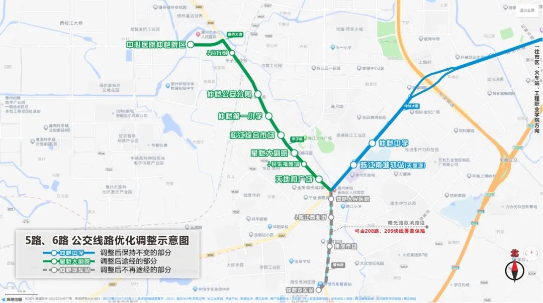 線路調整:取消6路仲愷人民醫院、陳江商業街、集成市場、仲愷汽車站等4個站點,改由曙光路口延伸經甲子路、康僑大道至中心醫院仲愷院區。
