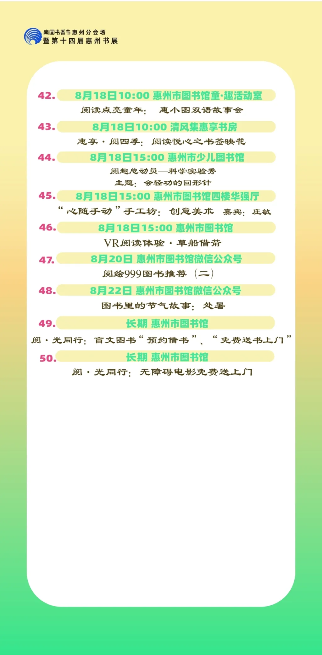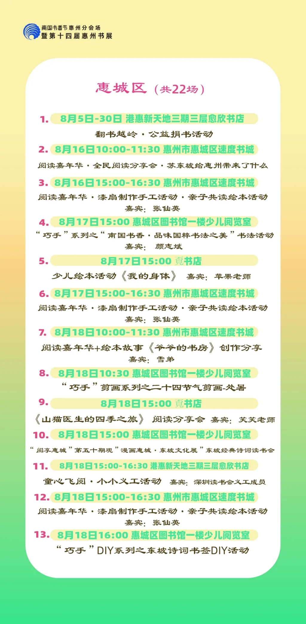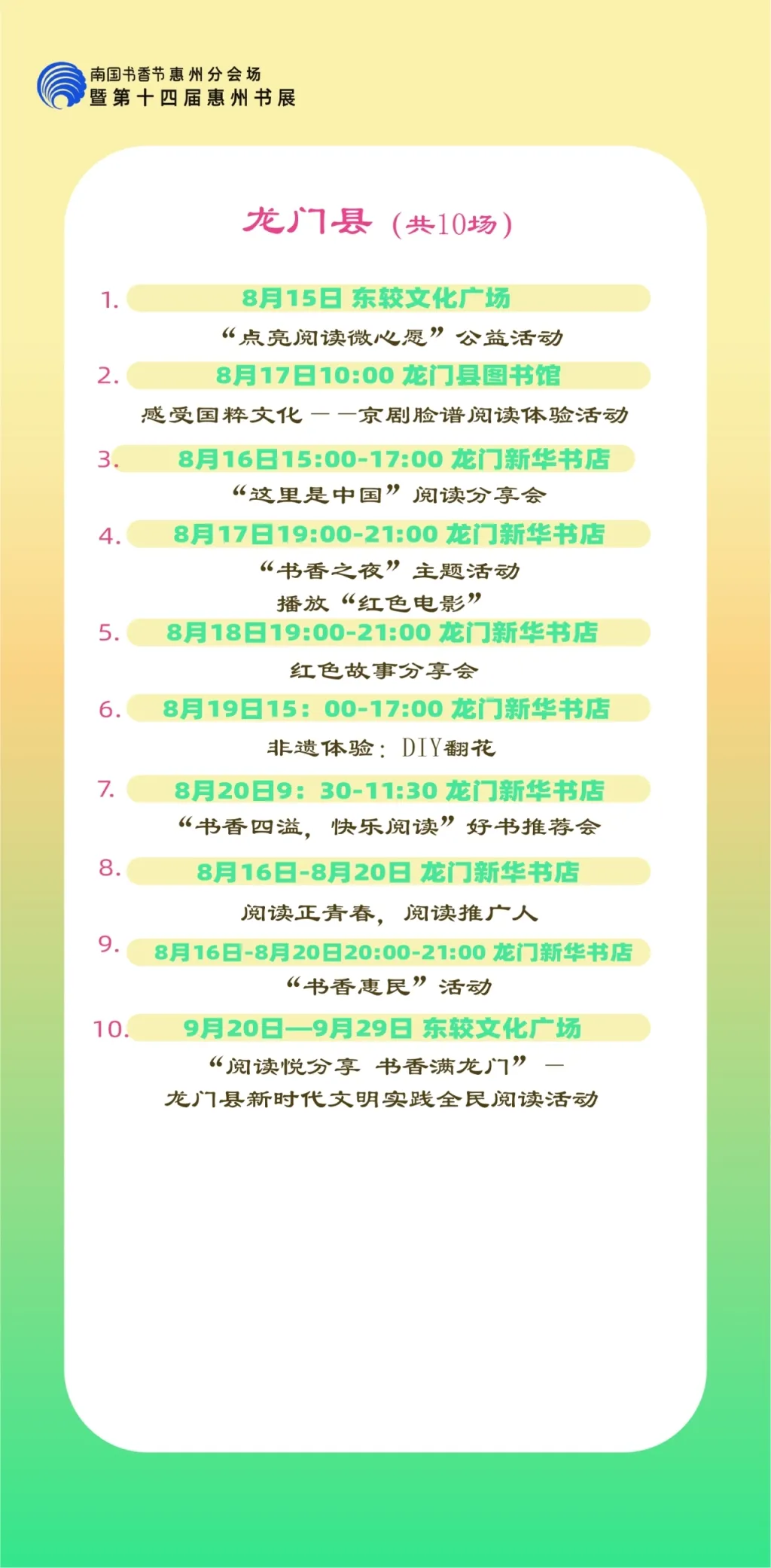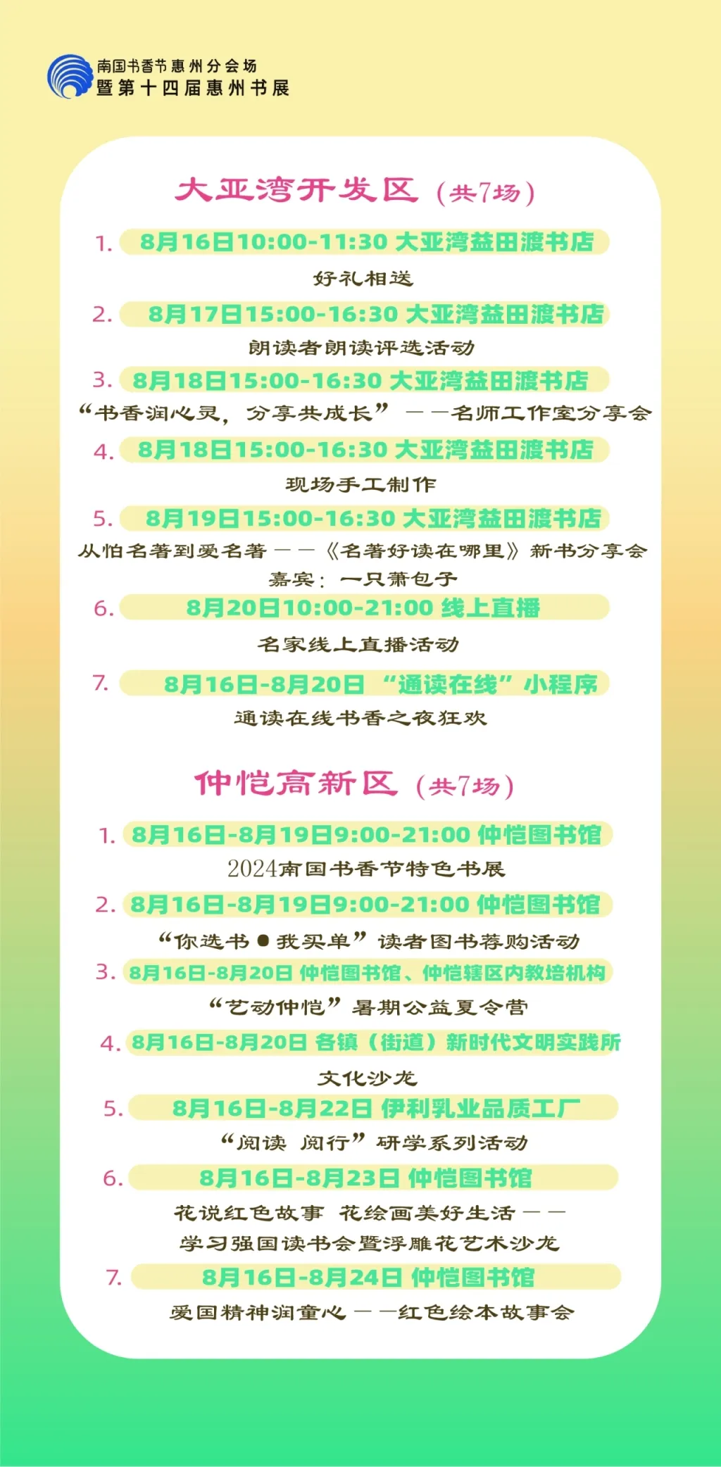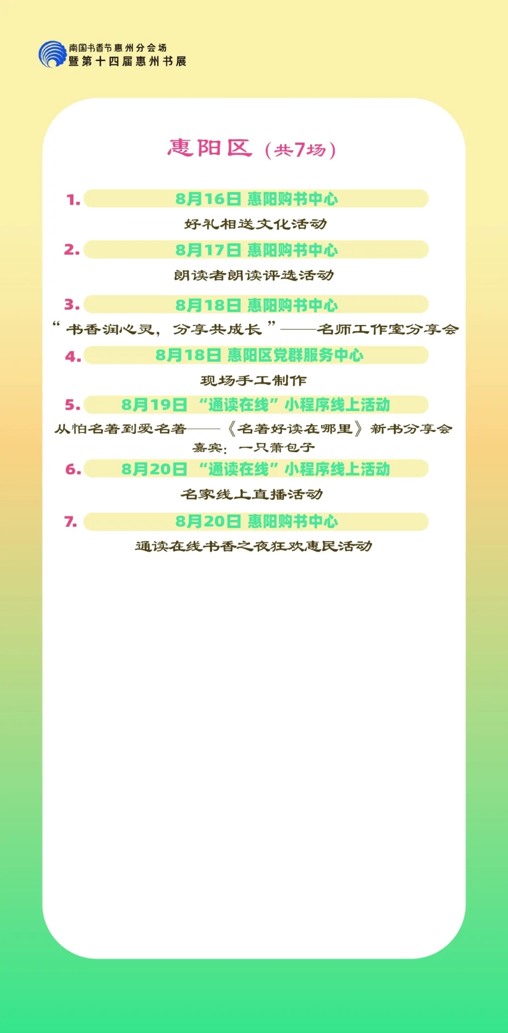 包括各縣區分會場,以及惠州市圖書館、東坡書房、豐湖書院、惠享書房、加速度書城、覔書店、愈欣書店,各縣區新時代文明實踐所(站)等