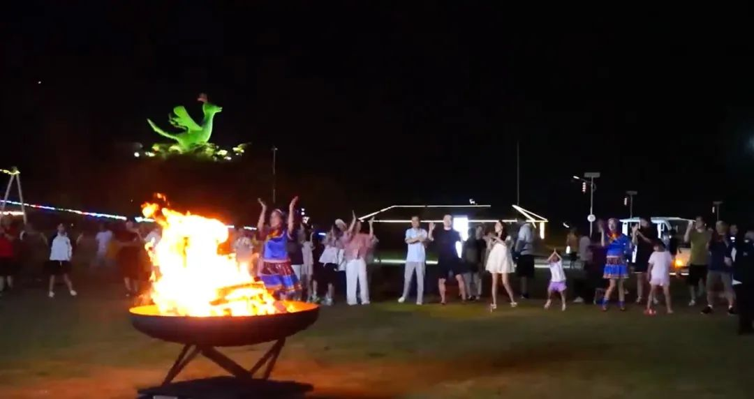 晚上 8 點,音樂噴泉和燈光秀在鹿鷹園準時上演,噴灑而出的水霧,還為周邊游客帶來了絲絲清涼。除了音樂噴泉和燈光秀,國家非遺項目打鐵花和來自龍門藍田鄉的省級非遺項目舞火狗也接連上演,其中圍繞篝火進行的舞火狗活動還會帶動游客一起加入狂歡。