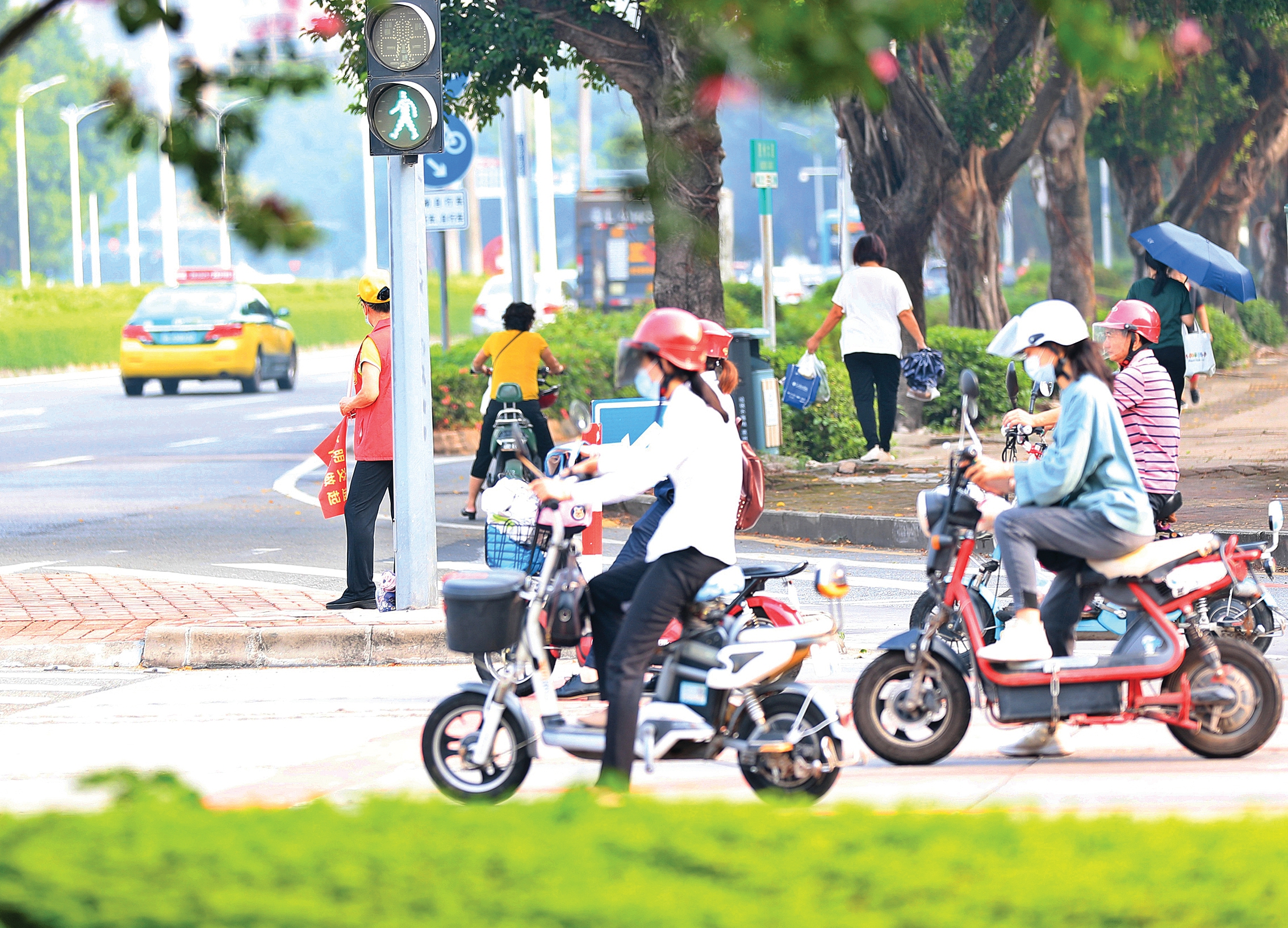 騎電動自行車的市民在等紅綠燈。惠州東江圖片社供圖