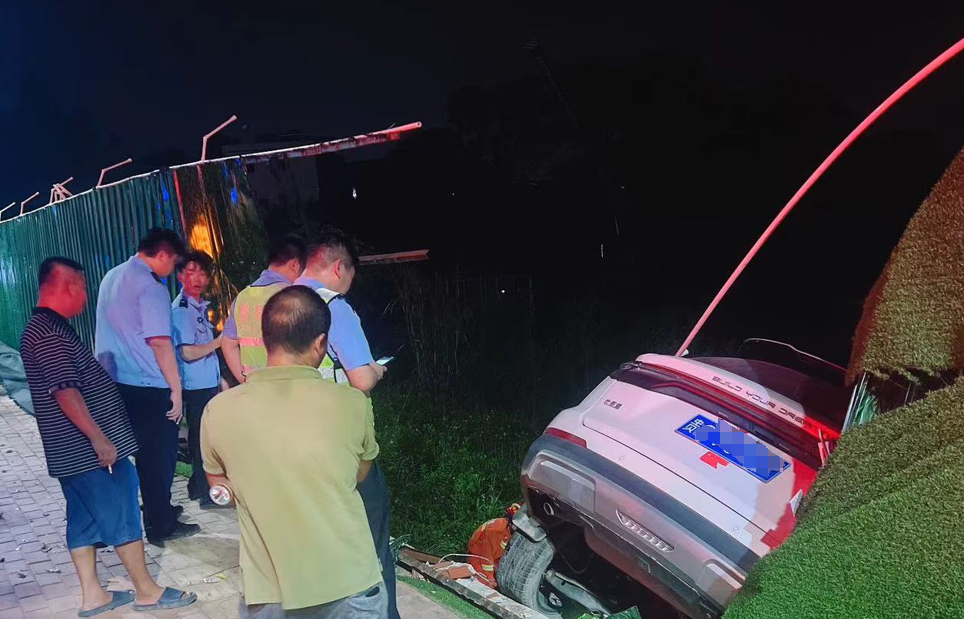 到場后,消防救援人員發現一輛白色轎車沖出人行道,懸掛在人行道與田地間,滿身酒氣男子躺在草叢上。消防員確認無其他被困人員后,立即用擔架將男子固定后抬至路面移送醫護人員。