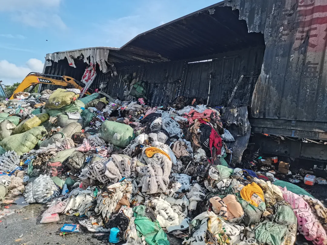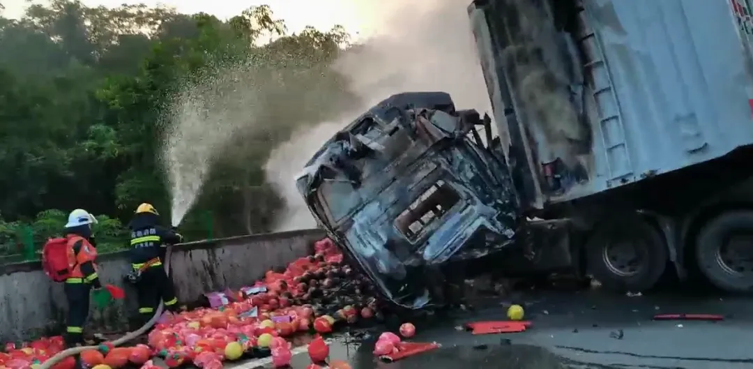 由于兩車相撞起火,貨物正猛烈燃燒,