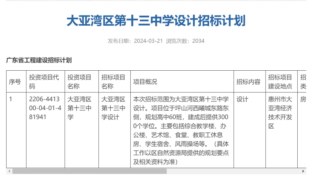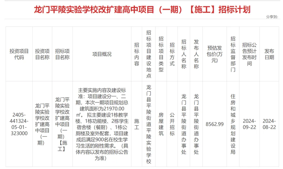 此外,惠州市公共資源交易中心還發(fā)布了龍門平陵實(shí)驗(yàn)學(xué)校改擴(kuò)建高中項(xiàng)目(一期)設(shè)計(jì)、施工和監(jiān)理招標(biāo)計(jì)劃。