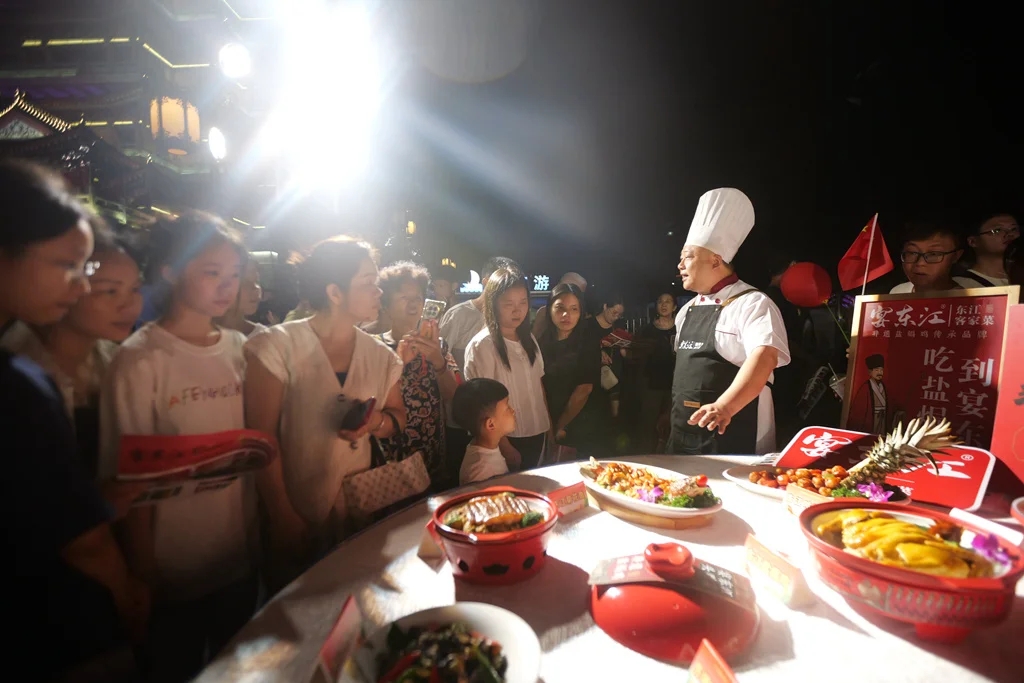 位于水東街的惠州2024國慶美食嘉年華集市,宴東江的總廚陳加強正在向游客展示菜品。