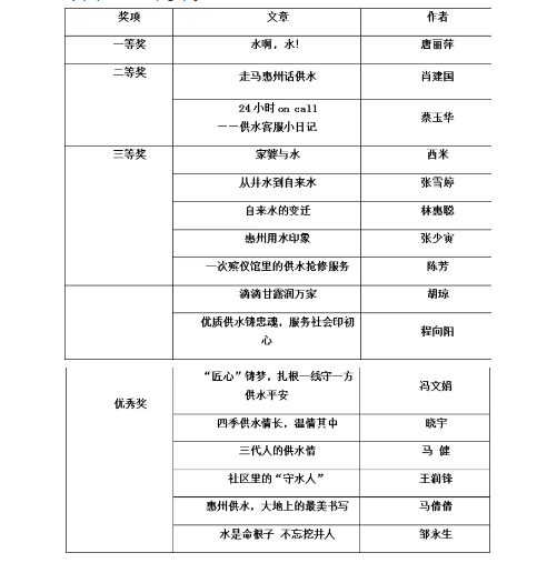 活動共征集近300篇優秀作品,涵蓋通訊、散文、回憶錄、隨筆等,最終由專家評審團評選出獲獎作品。《水啊,水!》《走馬惠州話供水》《24小時on call——供水客服小日記》……一篇篇優秀征文作品,傾注了作者的真情實感,以樸實的語言和生動的細節,反映在黨和國家領導下建設中國特色社會主義偉大事業和惠州供水事業的成果。