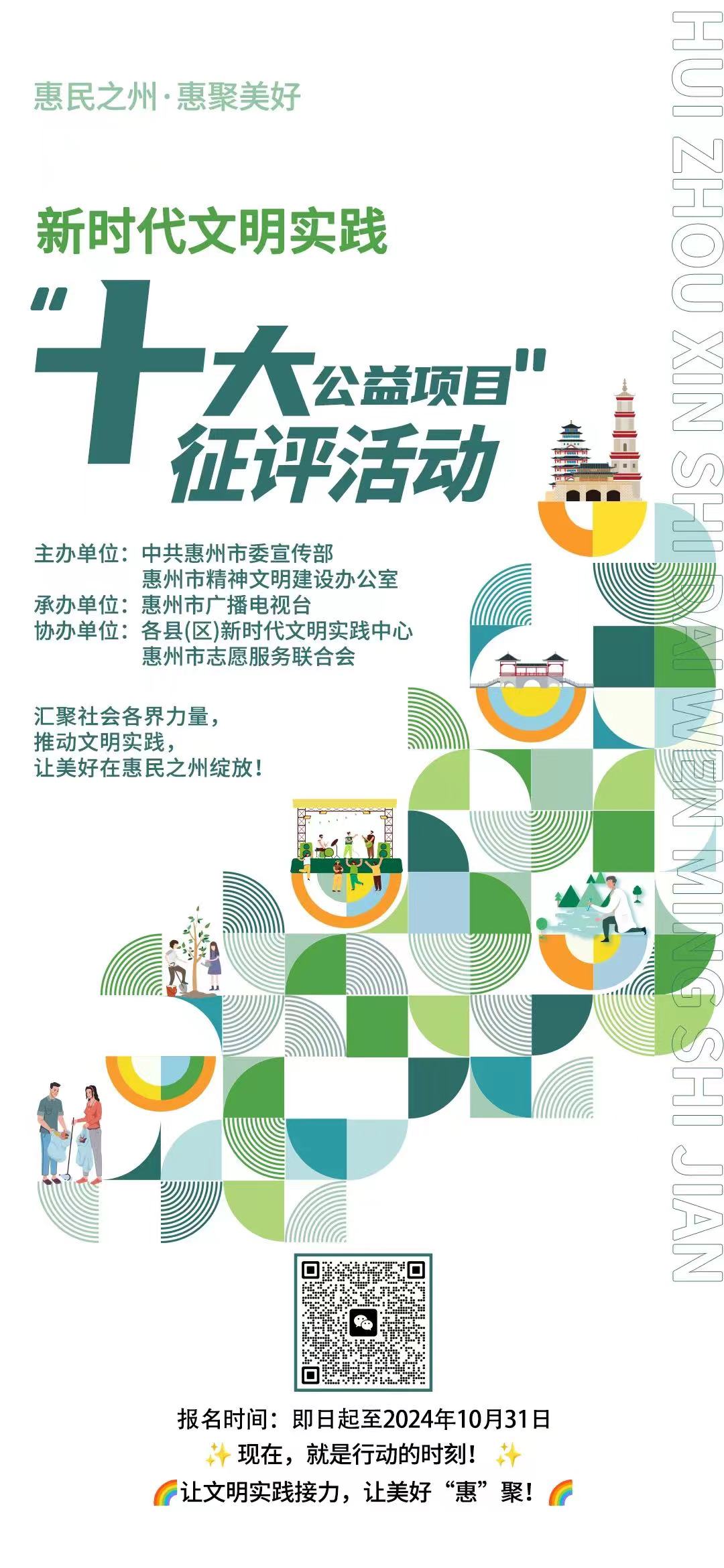 為進一步實施“惠民之州·惠聚美好”傳播工程,推動惠州市新時代文明實踐工作提檔升級,激發社會各界參與文明實踐的熱情與創造力,圍繞文明實踐賦能“百千萬工程”,精準對接群眾需求,中共惠州市委宣傳部、惠州市精神文明建設辦公室開展惠民之州·惠聚美好——新時代文明實踐“十大公益項目”征評活動。
