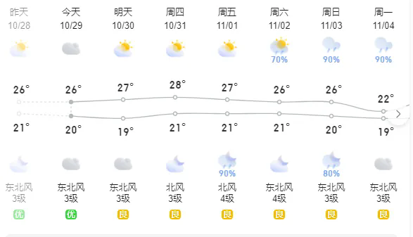 預計,今天白天我市各地多云間陰天,最高氣溫27℃左右;30日,多云到晴天,最低氣溫19~21℃,最高氣溫28℃左右;31日-11月2日,晴朗干燥,最低氣溫17~20℃,最高氣溫28~30℃;3-4日,多云為主。
