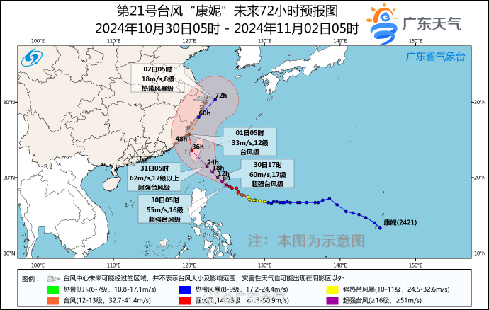 據廣東天氣29日11時的消息,今年第21號臺風“康妮”(臺風級)強度逐漸增強,最強可達強臺風級或超強臺風級(48-55米/秒,15~16級),并將于31日中午到傍晚在臺灣島南部沿海登陸,隨后穿過臺灣島進入臺灣海峽,登陸或擦過福建沿海地區,隨后轉向偏東北方向。
