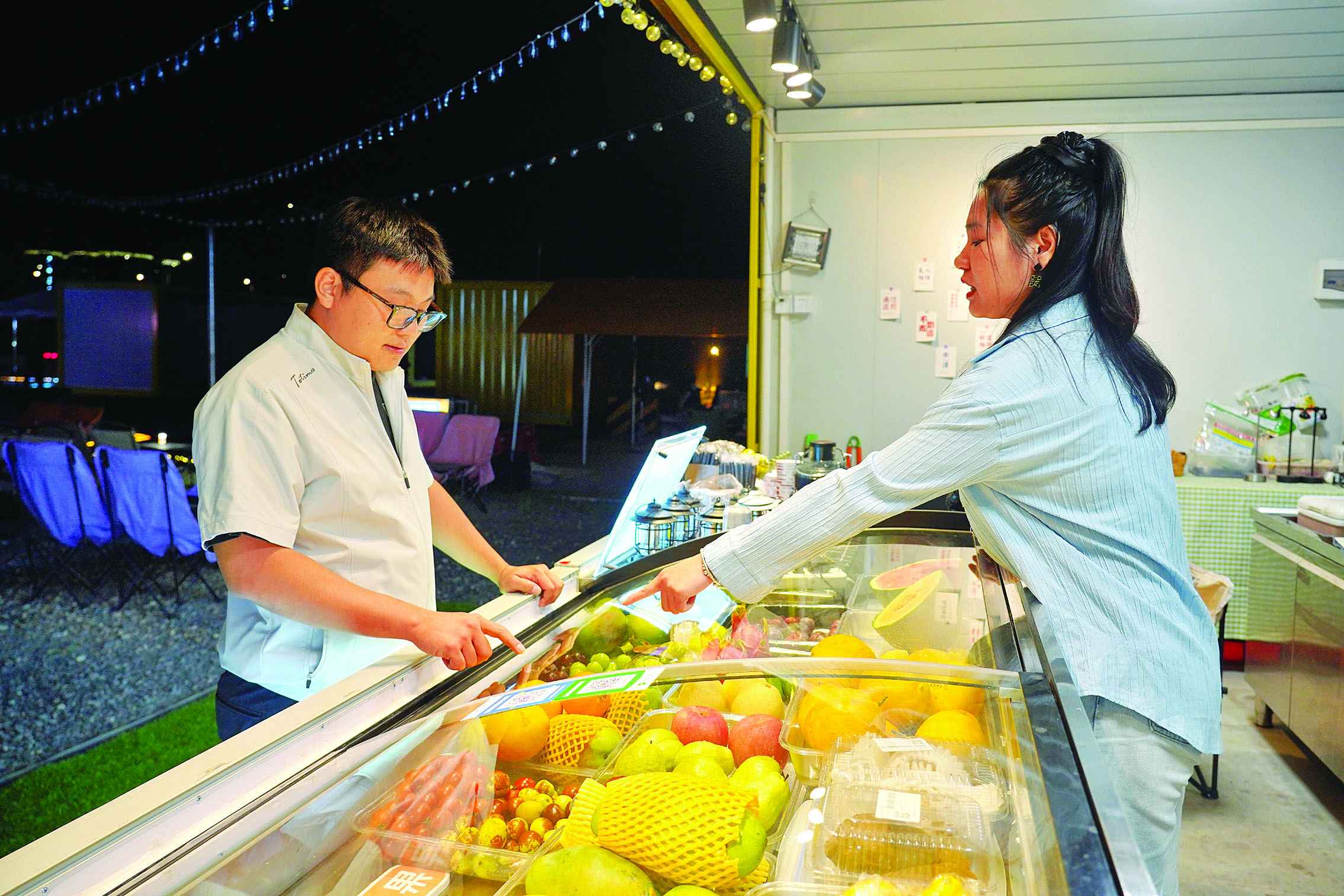 晚上9時,花里頭潮聚公園迎來客流高峰,在車水馬龍的城市中,這里別有一番風味:10米高的卡通充氣模型、五顏六色的集裝箱、擺滿廣場的露營折疊座椅、抱著吉他的駐場歌手、童年記憶里的露天影院……