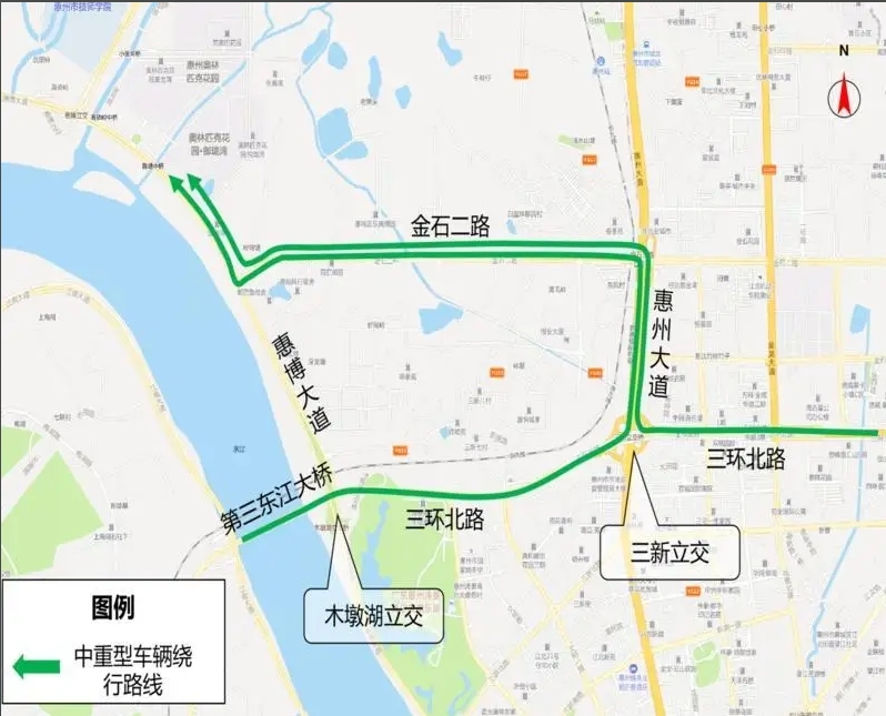 交通管制期間,木墩湖立交由三環北路轉惠博大道(往博羅方向)的匝道封閉,禁止車輛通行。建議原從第三東江大橋轉惠博大道(往博羅方向)的中重型貨車,請沿三環北路直行至三新立交橋,通過惠州大道-金石二路-惠博大道繞行;原從三環北路轉惠博大道(往博羅方向)的中重型貨車,請提前在三新立交橋處右轉,通過惠州大道-金石二路-惠博大道繞行。