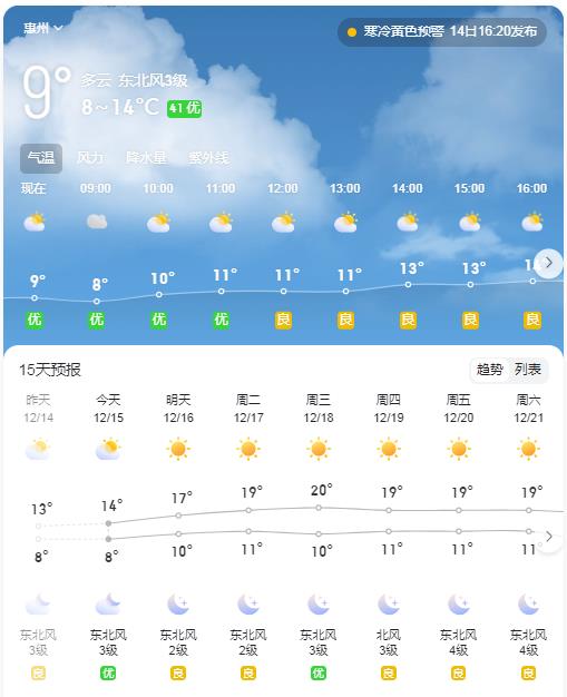 惠州日報訊 (記者劉建威)12月14日下午,我市龍門縣發布了寒冷橙色預警信號,其余縣(區)相繼發布了寒冷黃色預警信號。市氣象臺預計,未來一周我市冷空氣頻繁,早晚寒冷,北部和東部山區局部有霜凍。