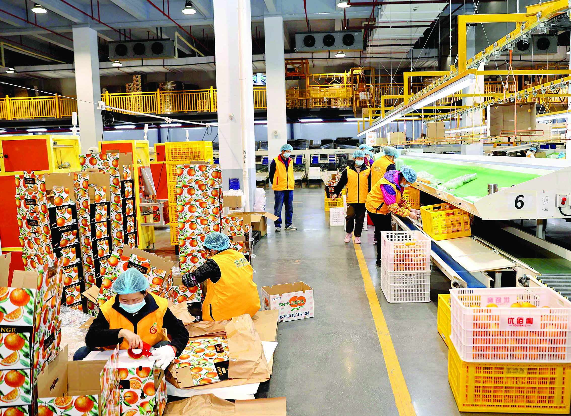 在粵港澳大灣區(qū)(廣東·惠州)綠色農產(chǎn)品生產(chǎn)供應基地,工人們打包新鮮橘子準備發(fā)貨。 惠州日報記者李松權 攝