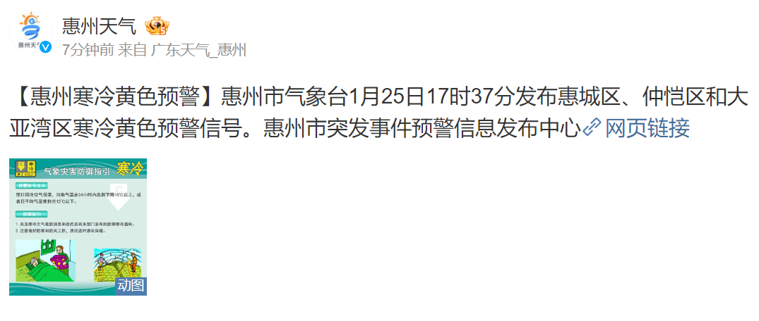 惠州發布寒冷黃色預警受強冷空氣影響,預計未來24小時我市氣溫明顯下降,海陸風力增大,惠州市氣象臺1月25日17時37分發布惠城區、仲愷區和大亞灣區寒冷黃色預警信號,請注意防御。惠州市突發事件預警信息發布中心