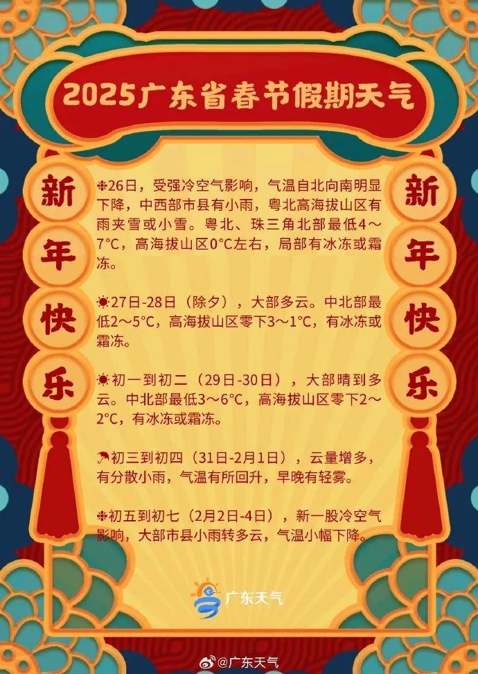 惠州春節天氣預計,強冷空氣將于26日早晨至中午自北向南影響我市,伴隨大風和分散小雨,氣溫明顯下降;27日-30日(年廿八至初二)轉晴冷干燥,早晨最低氣溫:北部和東部山區2~6℃,有霜凍,其余地區6~11℃;31日-2月2日(初三至初五),云量增多,間中有分散小雨和輕霧,氣溫回升;2月3日-4日(初六至初七),受新一股冷空氣影響,氣溫小幅下降。春節前及假期前期,強冷空氣將給我市帶來低溫和大風天氣,對交通出行和生產生活有明顯影響,需做好相關防御工作。