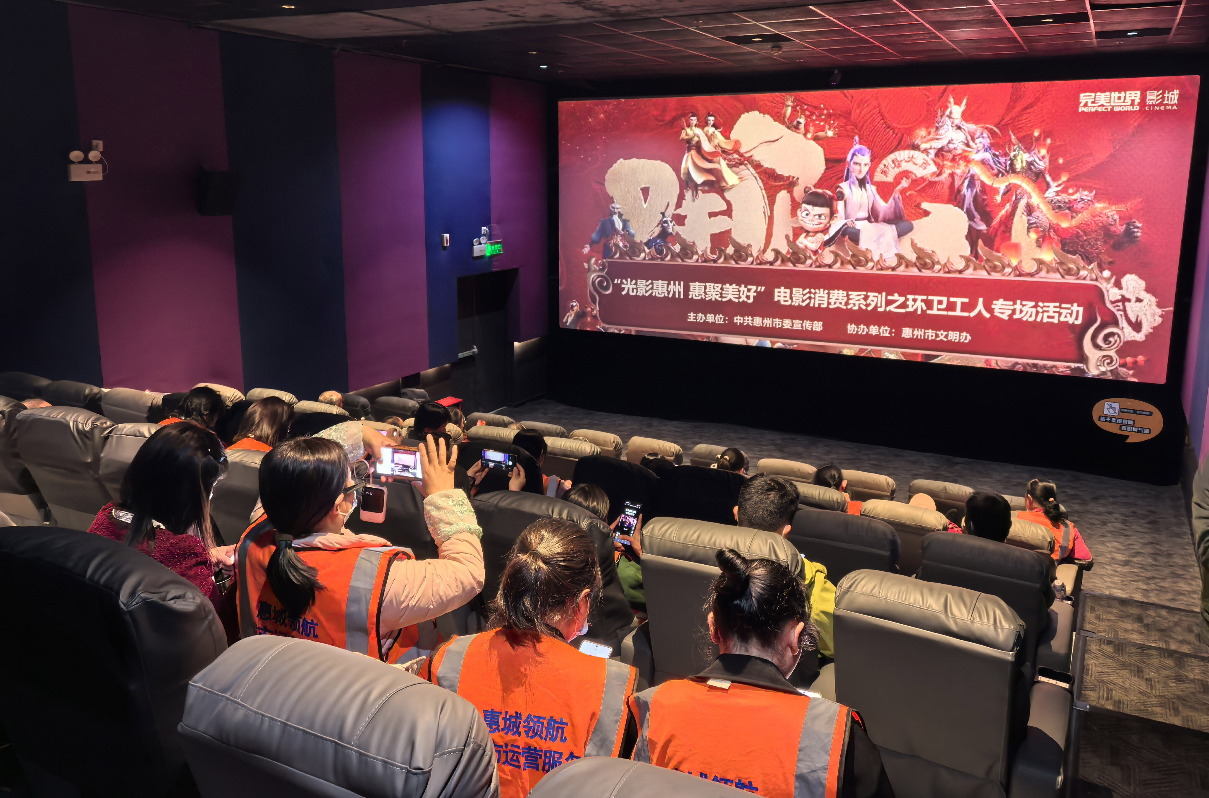 日前,為回饋高層次人才及春節(jié)期間在惠在崗工作人員的無私奉獻,“光影惠州 惠聚美好”電影消費系列活動之“過年請您看電影”“跟著電影品美食”專場公益活動在惠州吉之島完美世界影城舉行,約200名高層次人才、公安干警、志愿者、環(huán)衛(wèi)工人等受邀觀看了熱映電影《哪吒之魔童鬧海》,給春節(jié)期間在惠在崗人員帶來了濃濃的暖意。