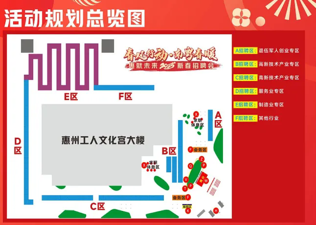 其中,企業招聘區又分為A區-退伍軍人創業區、B區-高新技術產業區、C區-高新技術產業區、D區-服務業區、E區-制造業區和F區-其他行業區等六大特色招聘區域。
