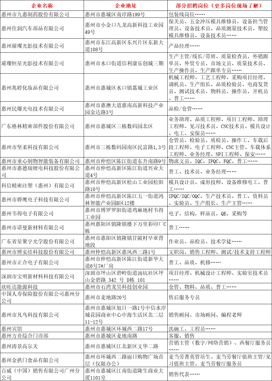 據統計,報名參與此次招聘會的企業,來自惠州三區四縣,合計超300家!涵蓋制造業、服務業、金融業、餐飲業、交通運輸業等各行各業,為惠州人力資源市場提供約3萬個就業機會。