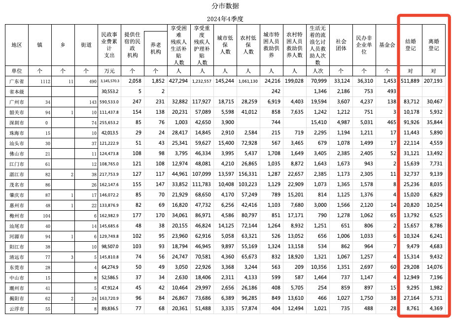 據(jù)廣東民政事業(yè)統(tǒng)計季報(2024年第四季度),2024年廣東結(jié)婚登記數(shù)為51.2萬對,較2023年(63.2萬對)減少約19.0%;離婚登記20.7萬對,較2023年(19.1萬對)有所上漲。