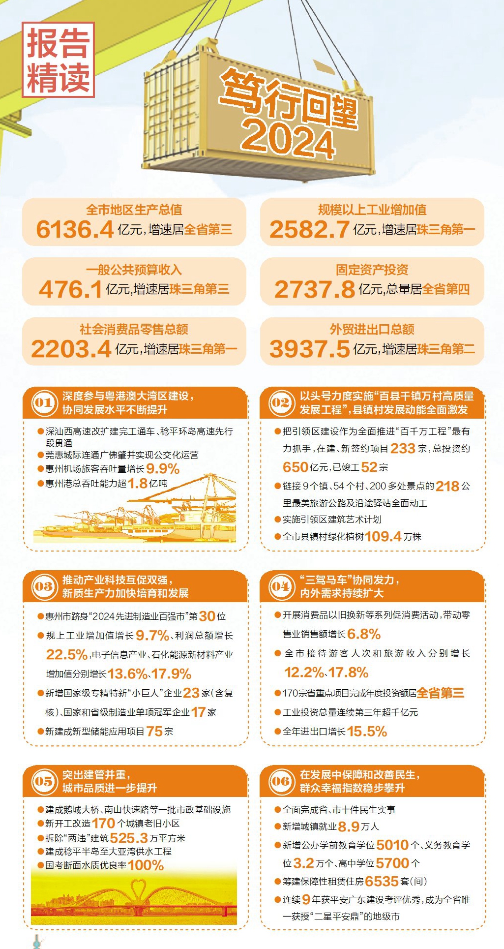 “融深融灣”“百千萬(wàn)工程”“江湖一體”“兩灣聯(lián)動(dòng)”……2025惠州市政府工作報(bào)告描繪了新的發(fā)展圖景,也提到了不少新詞、熱詞。這些新詞、熱詞,既是透視未來(lái)發(fā)展路徑的“風(fēng)向標(biāo)”,也是指引我們砥礪奮進(jìn)的“參照系”。它們背后的一項(xiàng)項(xiàng)舉措,也將變成惠州務(wù)實(shí)創(chuàng)新的政策組合拳,在高質(zhì)量發(fā)展新征程上書(shū)寫(xiě)新答卷。