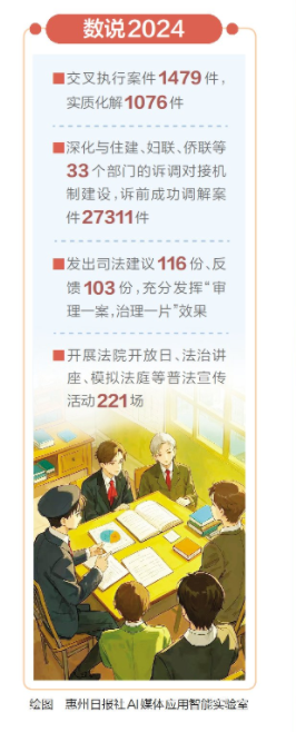 出臺案件閱核實施辦法,強化院庭長監(jiān)督管理職責,推進院庭長“閱核制”落地見效;優(yōu)化審判資源配置,深化民商事案件繁簡分流改革;深入推進執(zhí)前督促、程序前移、統(tǒng)一立案、交叉執(zhí)行“四項機制”,推動執(zhí)行工作從“末端執(zhí)”轉(zhuǎn)向“前端治”;堅持把非訴訟糾紛解決機制挺在前面……惠州市中級人民法院相關(guān)負責人介紹,2024年,全市法院加快推進審判工作現(xiàn)代化,以改革創(chuàng)新助力提升審判質(zhì)效,促進司法更加公正高效權(quán)威。