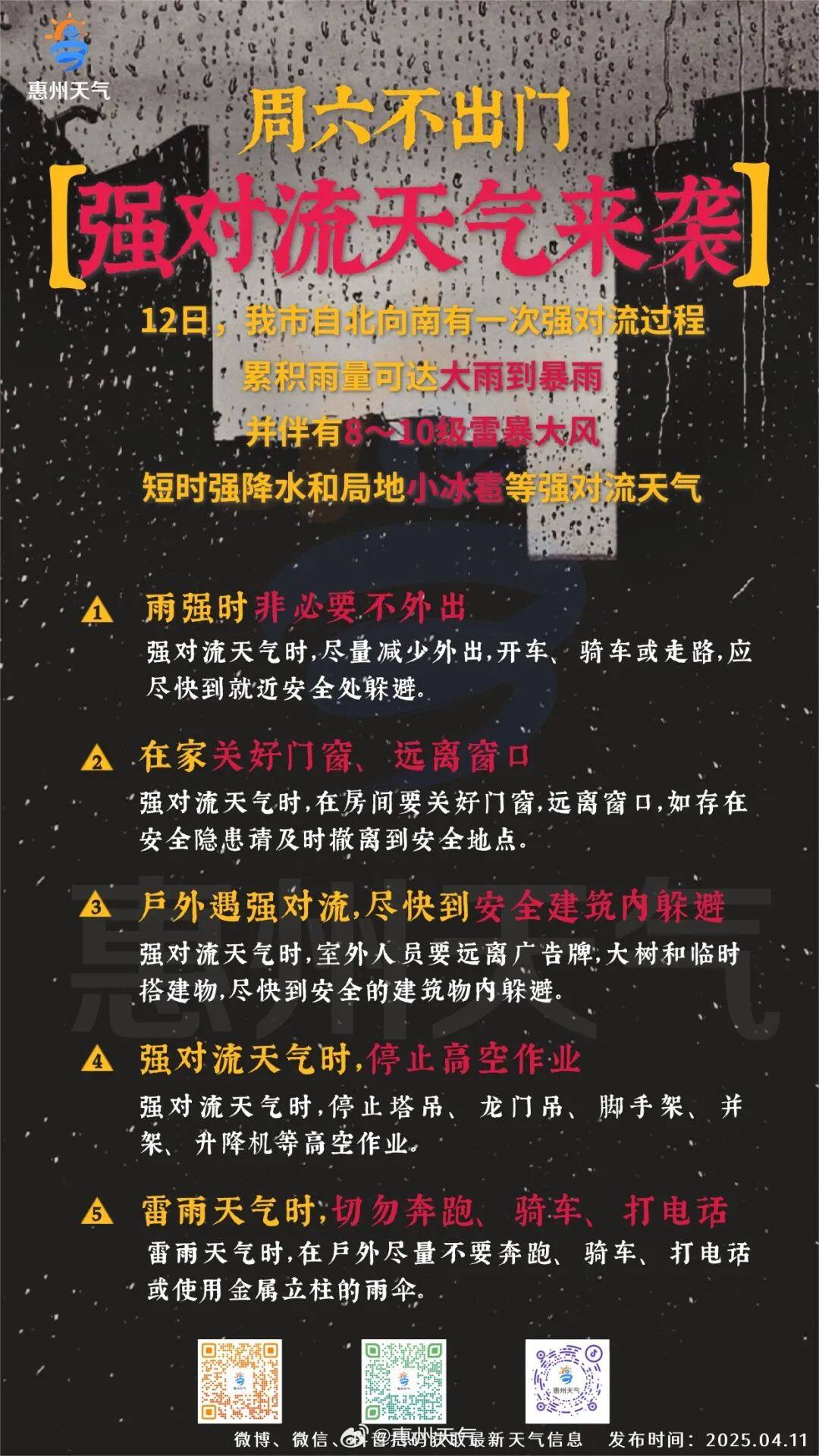 4月10日,廣東省應(yīng)急管理廳、自然資源廳、水利廳、農(nóng)業(yè)農(nóng)村廳、文旅廳、氣象局聯(lián)合發(fā)布強對流天氣防御提醒。4月11日晚至13日,廣東省將出現(xiàn)大范圍強對流天氣,有8至10級(局地12級)雷暴大風(fēng)、強降水和局地冰雹;洷焙椭槿堑貐^(qū)有大雨到暴雨,局部大暴雨。