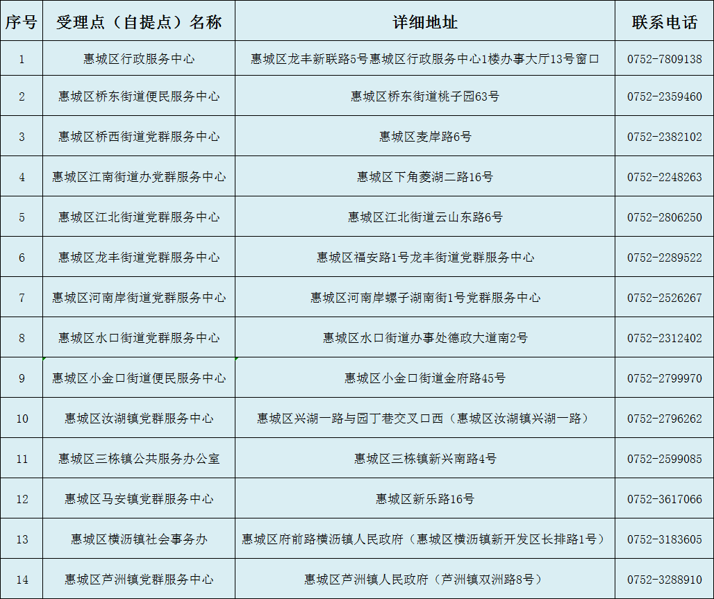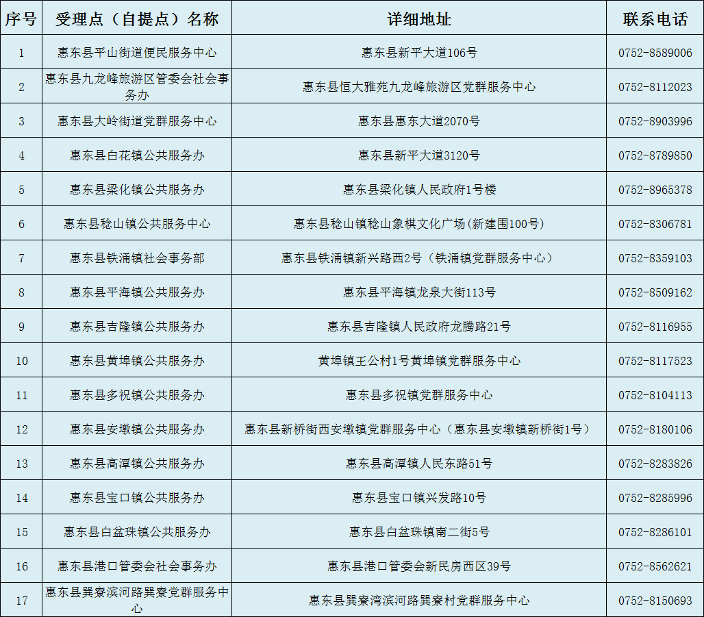 惠州市長者服務卡于今年2月開通線上辦理服務以來,受到廣大老年人的一致好評。年滿65周歲及以上在惠居住的老年人,可通過“惠州通”小程序線上申辦長者服務卡,可選擇到自提點自取或郵寄到家的方式領取卡。為方便市民申領長者服務卡,現新增5個并完善原78個受理點(自提點)信息,更新如下: