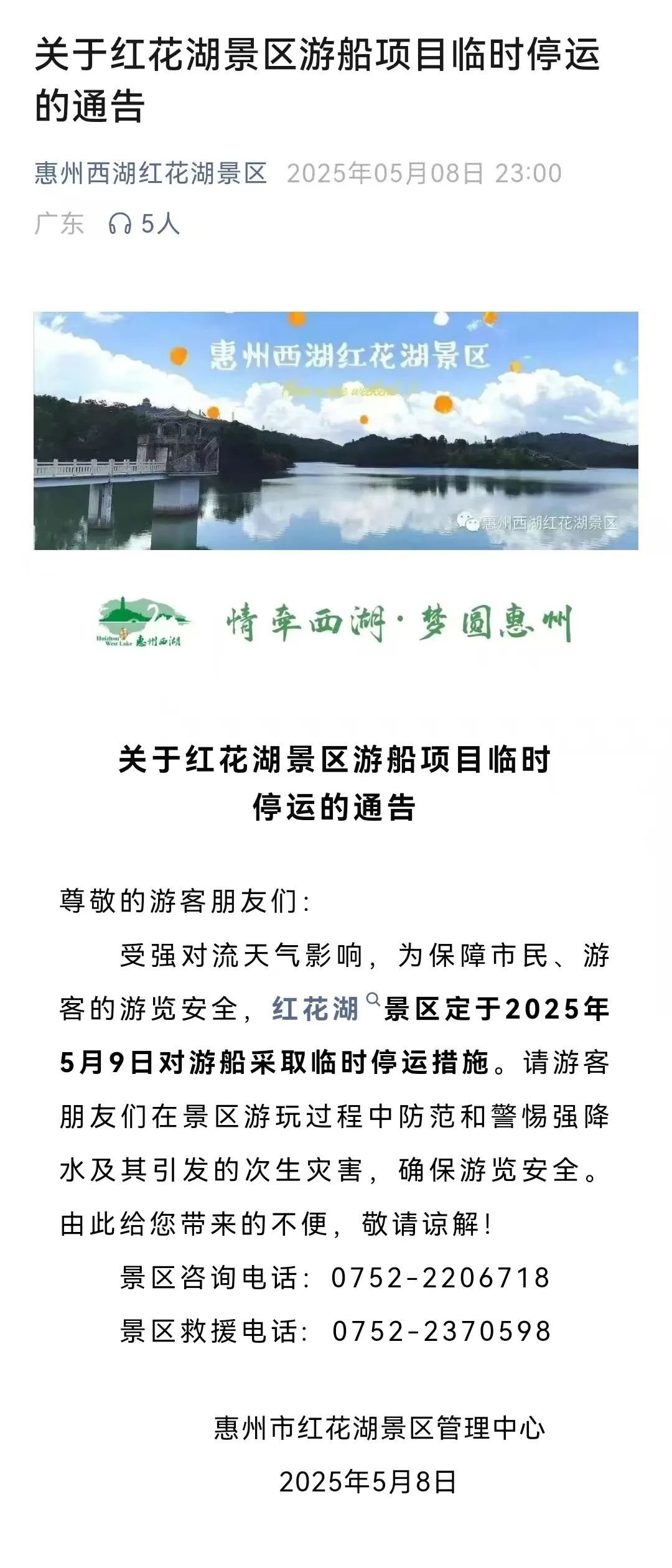 各位市民游客注意!受強對流天氣影響惠州西湖景區、紅花湖景區5月8日晚分別發布通告定于5月9日對景區游船項目臨時停運。
