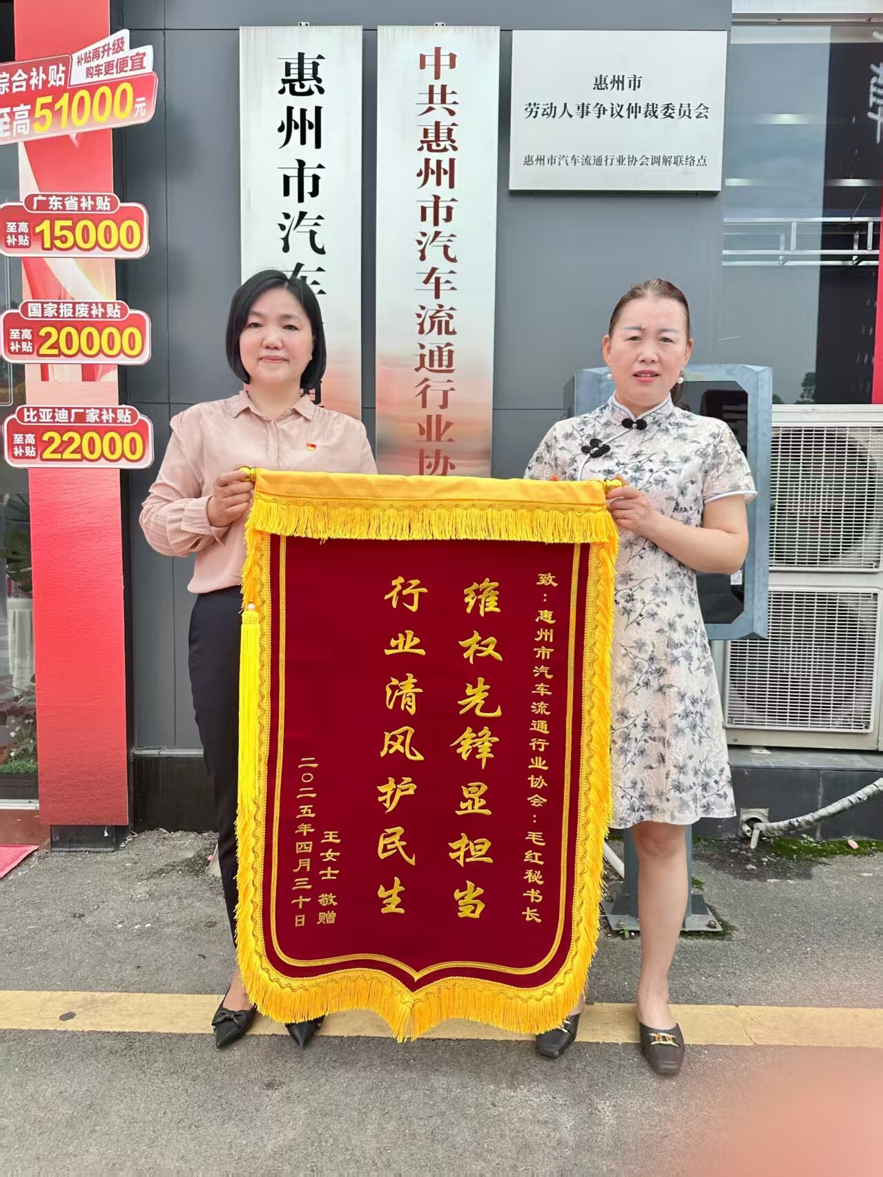 近日,王女士將一面寫(xiě)著“維權(quán)先鋒顯擔(dān)當(dāng) 行業(yè)清風(fēng)護(hù)民生”的錦旗送到惠州市汽車流通行業(yè)協(xié)會(huì),對(duì)該協(xié)會(huì)高效公正處理消費(fèi)投訴表示感謝。
