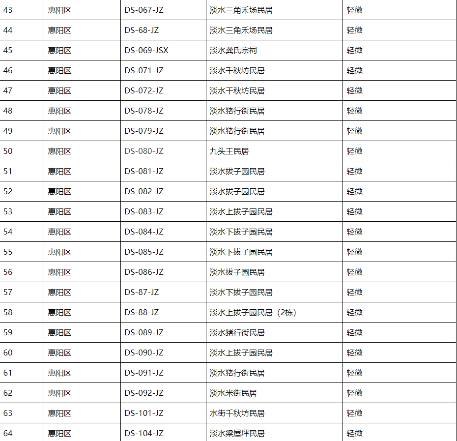 記者查閱惠州市2025年度歷史建筑維護修繕(輕微修繕)補助計劃名單獲悉,該批歷史建筑大多位于惠陽區,數量為75座;其余為惠城區9座,博羅縣6座,大亞灣區2座,仲愷高新區1座。
