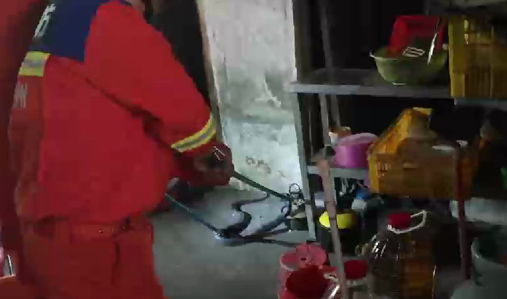 現場消防員瞅準時機,一把按住蛇頭,順勢將其裝進透氣的專用鐵籠中。
