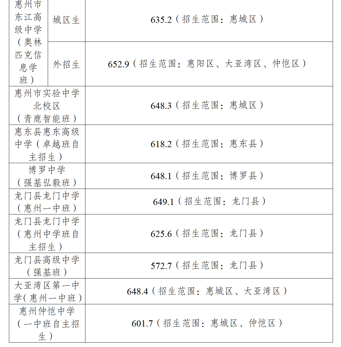 惠州市第八中學(鴻蒙班)城區生648.2分、外招生660.1分;惠州市實驗中學(訊飛智能班)城區生653分、外招生671.4分;惠州市東江高級中學(奧林匹克信息學班)城區生635.2分、外招生652.9分;惠州市實驗中學北校區(青鹿智能班)648.3分。