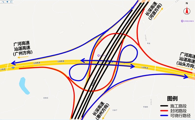 長深高速施工封閉及繞行示意圖。圖片來源惠州交警