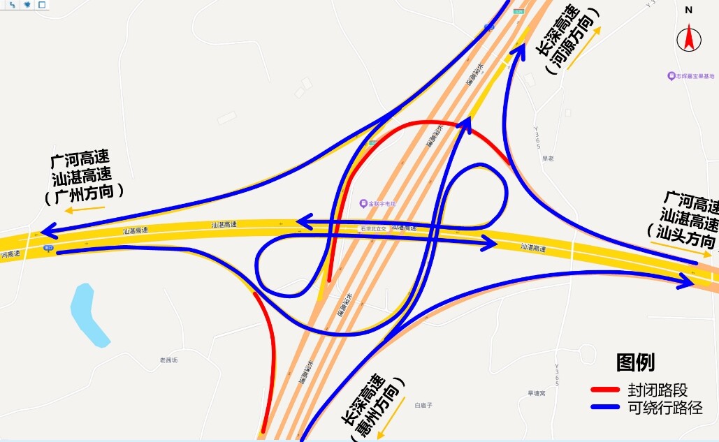 其中,石壩北樞紐立交至石壩互通(收費站)主線路段及廣河高速、汕湛高速轉長深高速惠州、河源方向出口匝道交通管制時間為7月28日10:00至7月31日10:00。管制期間,G25長深高速石壩北樞紐立交至石壩互通(收費站)主線路段及廣河高速、汕湛高速轉長深高速惠州、河源方向出口匝道封閉,禁止車輛通行。