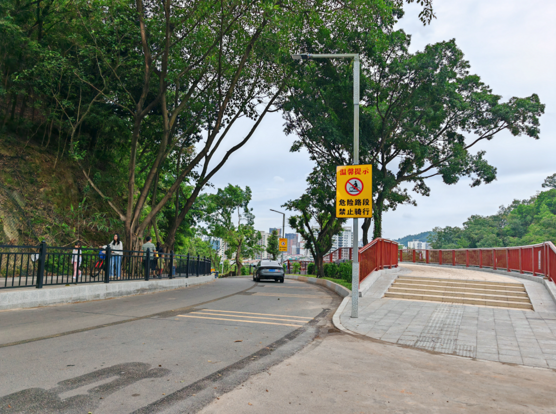 東門棧橋建成后,實現(xiàn)人車分流。棧橋兩側(cè)有“危險路段,禁止騎行”等溫馨提示牌。