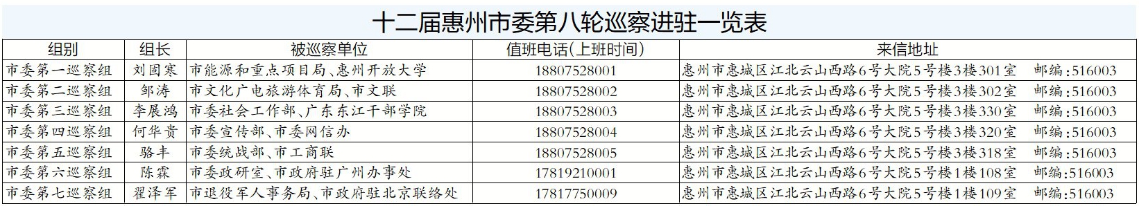 惠州日報訊 (記者袁暢 通訊員惠巡辦)根據惠州市委巡察工作統一部署,截至9月22日,十二屆惠州市委第八輪巡察已完成進駐工作,7個市委巡察組將對市能源和重點項目局、惠州開放大學等14個單位黨組織開展常規巡察。被巡察單位黨組織分別召開巡察進駐動員會。會前,各市委巡察組向被巡察黨組織主要負責人通報了有關工作安排;會上,各組長作了動員講話,對深入學習貫徹習近平總書記關于巡視工作的重要論述和對廣東系列重要講話重要指示精神,扎實開展本輪巡察工作提出明確要求。